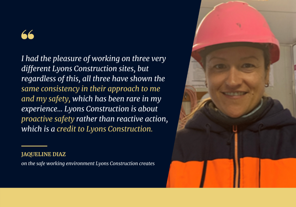 Jaqueline just wanted to let us know how much she appreciated working on the Lyons Construction sites and how our approach to safety and women in construction was a standout amongst the builders she’s worked with.